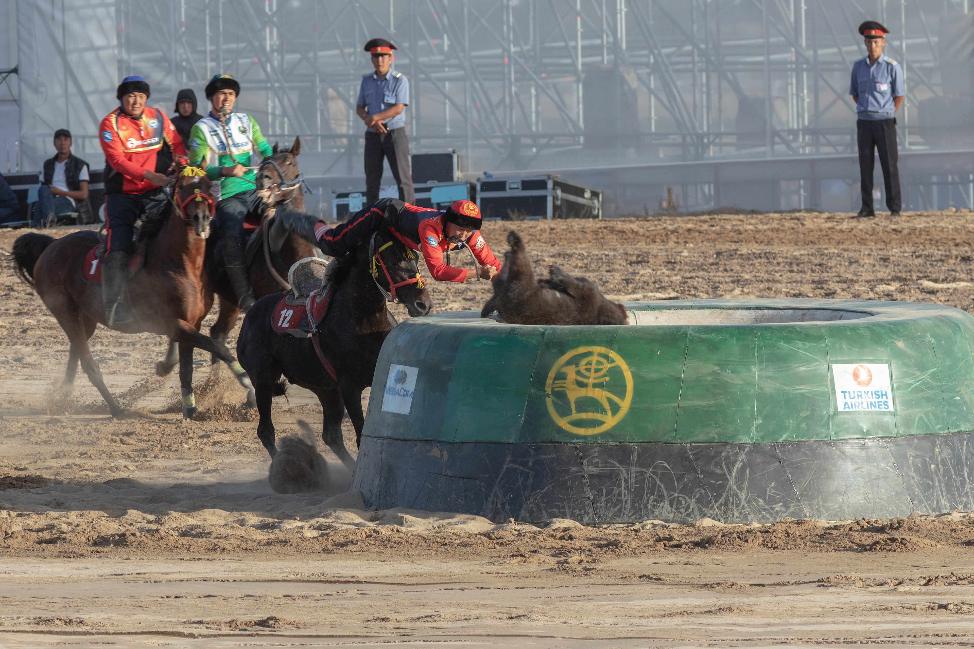 Een vorm van vrijetijdsbesteding die in de bergachtige gebieden wordt gespeeld, is Kok-Boru. Teams te paard moeten een onthoofd geitenkarkas van de grond oppakken en in het doel van de ander gooien. Het ruige spel wordt vooral door jonge mannen gespeeld. (Songkol, Naryn)